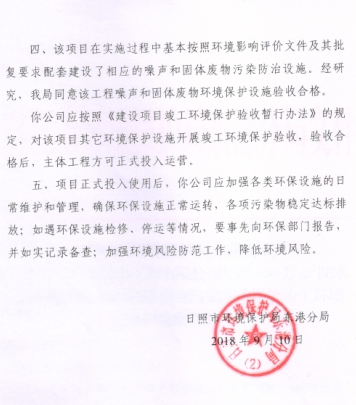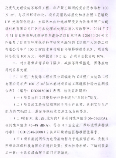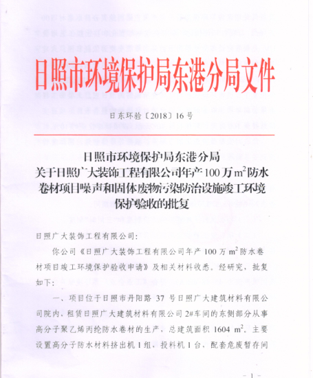 關(guān)于日照廣大裝飾工程有限公司年產(chǎn)100 萬 m2 防水卷材項(xiàng)目噪聲和固體廢物污染防治設(shè)施竣工環(huán)境保護(hù)驗(yàn)收的批復(fù)